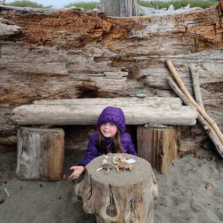Despite the weather being magnificent the majority of our drive, as we approached the coast we found ourselves suddenly in the midst of dense, low-level clouds. The easiest beach to access in the area was First Beach, and given the whining we experienced on the "hike" to the spit the day prior, we decided this would be the best option for the kids. First Beach was covered with large pieces of driftwood that had been used to create oceanside structures, huts, and houses. The kids (and us) thoroughly enjoyed climbing and playing in and around the driftwood structures. The clouds even lifted (for a moment) allowing us to see some of the massive rock formations that Pacific Northwest beaches are famous for.